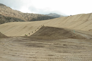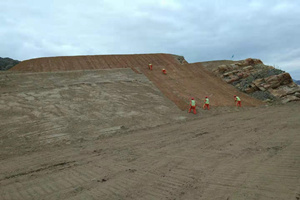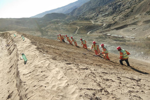 该工程位于阿尔泰山脉中部西南边缘山前地带,为中低山区,属构造剥蚀侵蚀型中低山地貌,海拔最高为1250m,最低1116m,最大高差134m,地形变化较大。本工程在排土场生态修复实际施工的过程中经历诸多困难。治理区年平均气温4.2℃,年降水量143-350.4毫米,年蒸发量1191.9-1884毫米,矿区多东南风,最大风力可达10级。较低的气温、较少的降雨使种子难以发芽,加之大风等恶劣天气,对工程的施工安全和治理的效果产生了很大的威胁;年蒸发量为降雨量的6倍,使得工程养护周期加长、养护质量要求变高;5个月的冻土期时间长,使得植物难以存活,边坡挂网施工,喷播难以存土;边坡平台覆绿主要工程工序多,施工空间交叉复杂,受到矿山生产作业的限制,特别是采场平台多数为车辆不能通行平台,需人员进入高处作业,施工难度较大且需兼顾矿山生产等各种因素使得本工程安全生产管理问题突出。